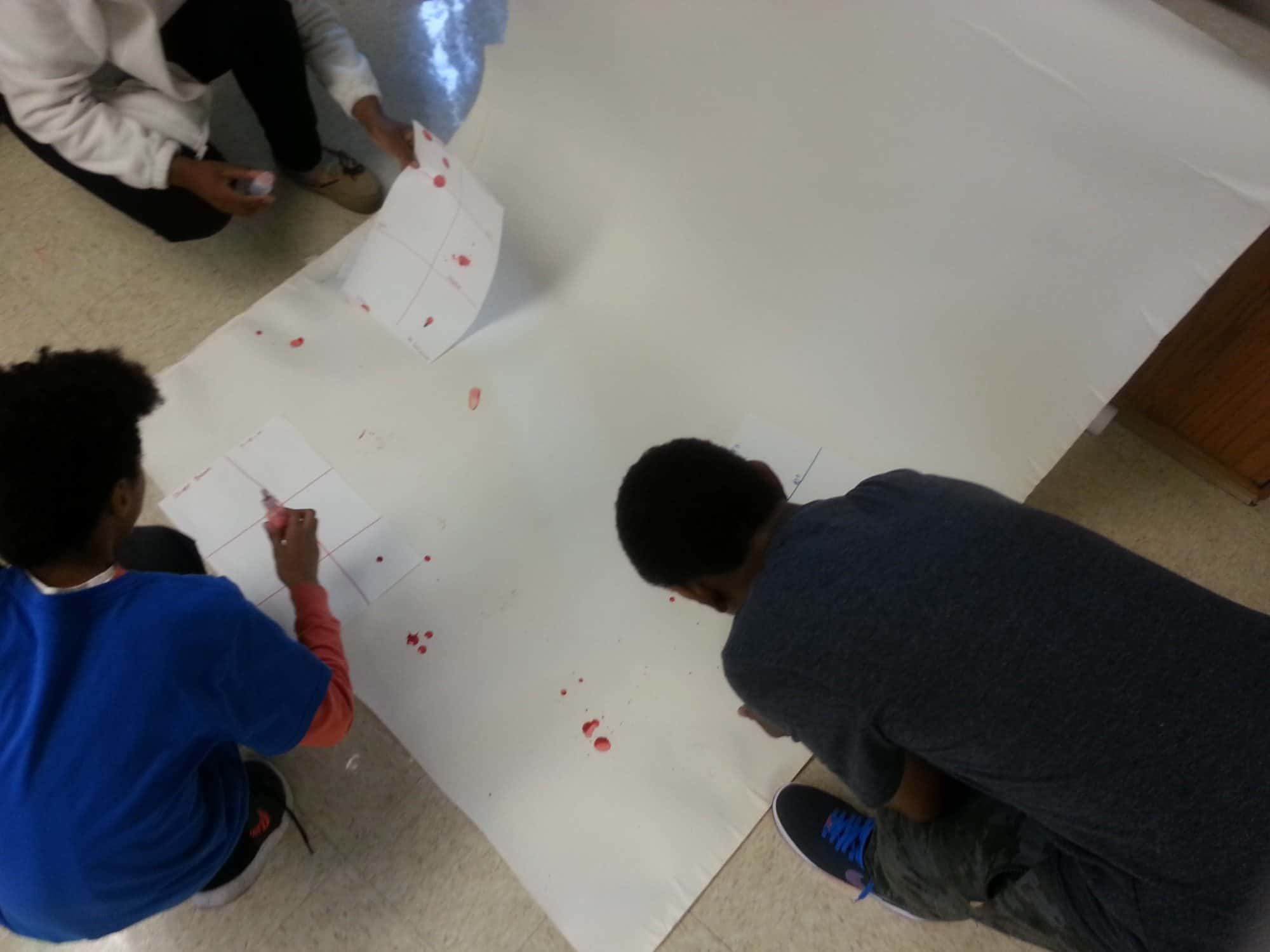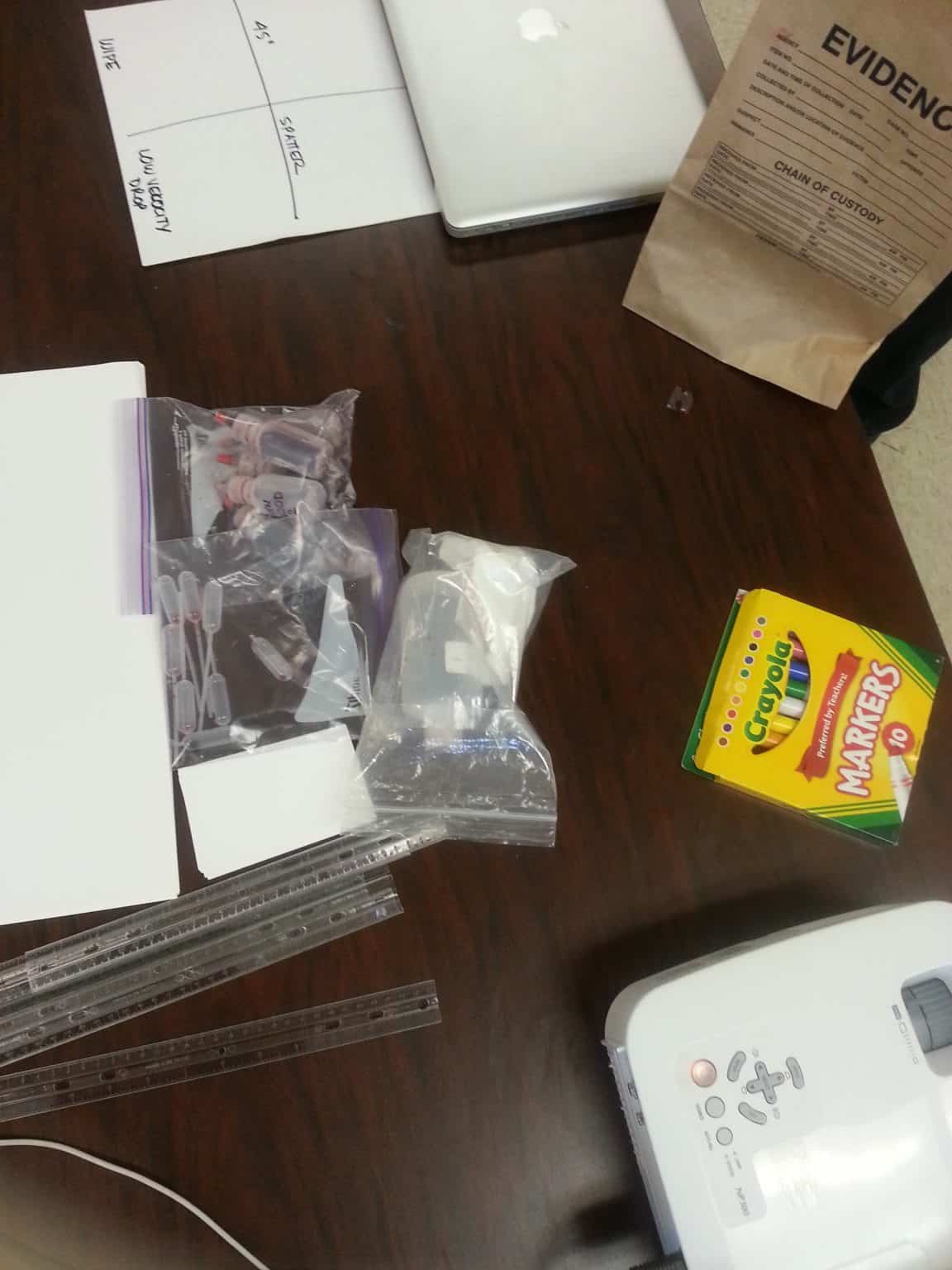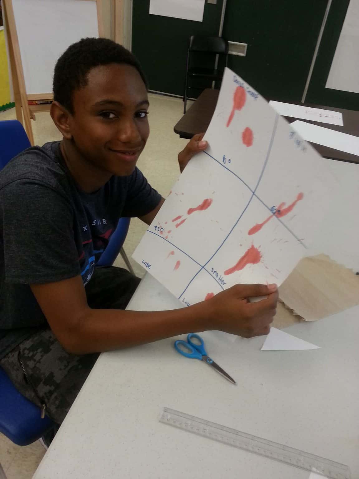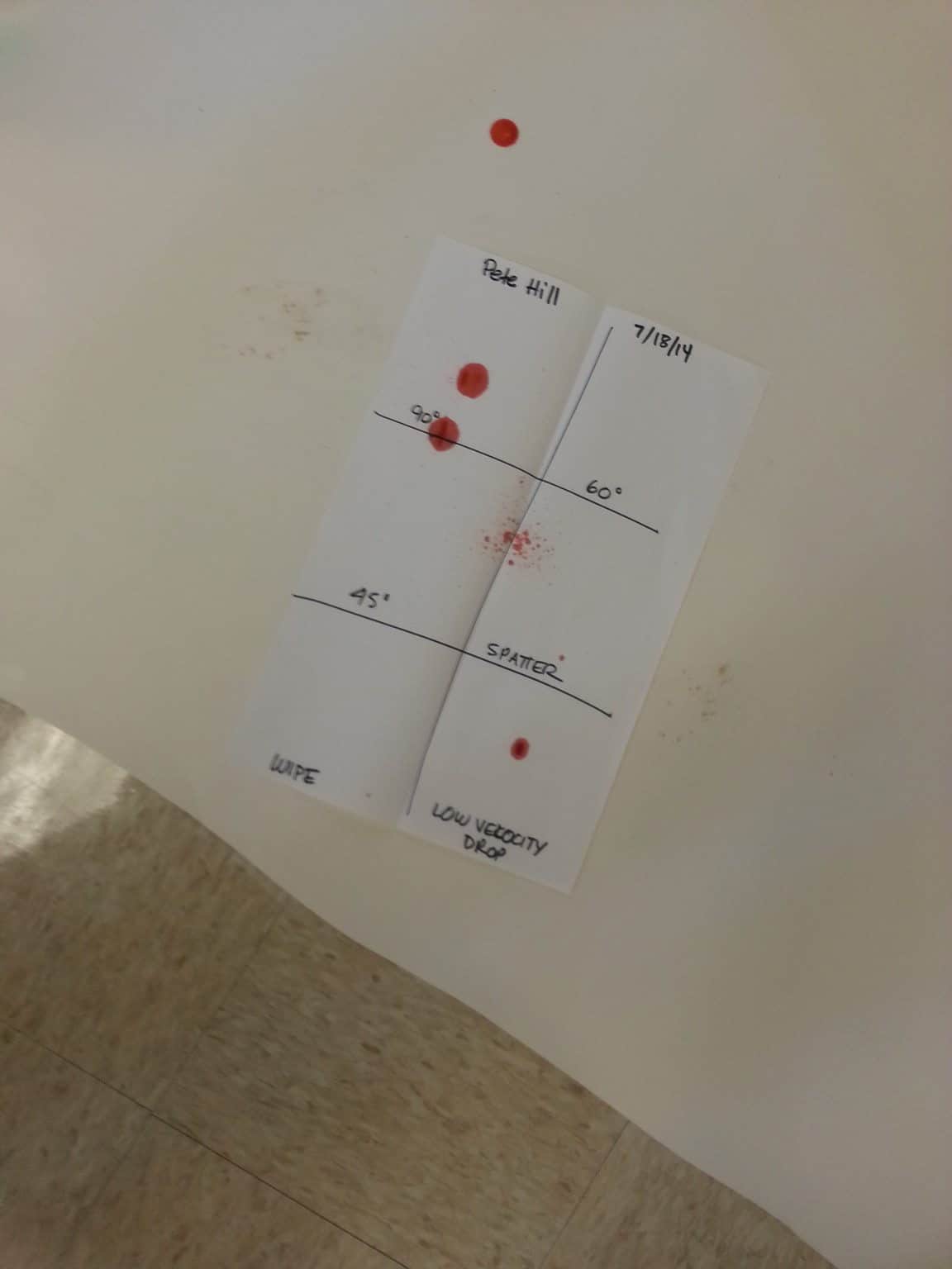 Our final lesson of the week was Blood Spatter with Mr. Pete Hill, one of the most amazing scientists! Mr. Pete started his lesson with a short intro to Blood Patterns by gun and knife. Such an interesting lesson! Our crews were very engaged into each and every slide Mr. Pete presented. Our next step was to plunge into a hands-on work with blood! Blood patterns from different angles. 90* 60* 45* Spatter. Wipe. Low Velocity Drop. Each crew was assigned to make a 3-4-5 paper triangle to measure the angle as they drop the blood. Mr. Pete guided each crew step by step so that everyone could have a chance to experiment from all angles and patterns. Everyone so much enjoyed dropping the blood J We learned that these blood patterns do show the criminal’s behavior, attacking point, and directions. We had only little time left before dismissed so Mr. Pete had the crews taste just a little bit what fingerprints lab is like. The rest to be continued next week with a real crime scene investigation.