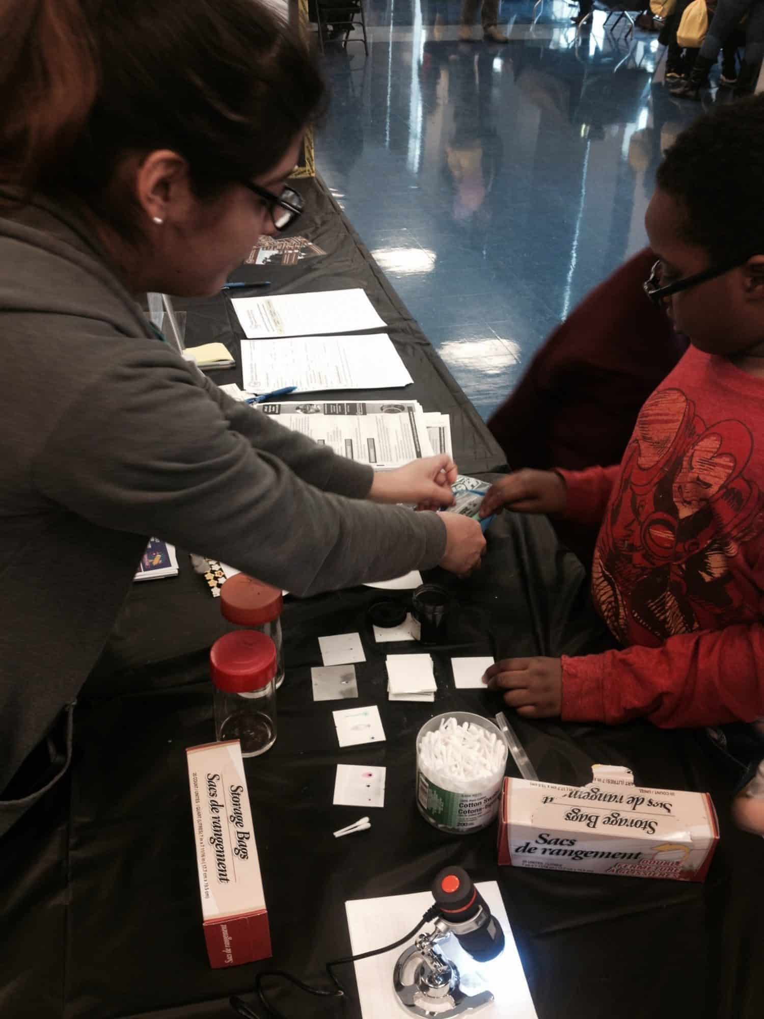 Welcome to Destination Chicago!! On January 24th, 2015, Project Exploration was privileged to team up with many different organizations at this great event provided by the Chicago City of Learning (CCOL) and Hive Chicago, at Jones College Prep High School. We gave the students from all over Chicago a chance to test their curiosity in criminal science with our Forensic Science summer program. We even had a real Forensic Scientist there too! Lisa Gilbert, from the Illinois State Police Department – Forensic Science Center, was very helpful in really showing the kids how fun her career is. She even taught our facilitators a thing or two on her work with latent prints!!