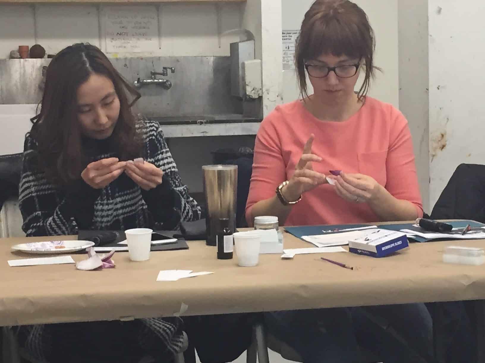 As I peered into the microscope’s eyepiece, a rectangular-shaped image slowly came into focus. And there they were—the plant cells. In the elodea slide they were a bright spring green, but in the onion, no such color could be detected, save the murky yellow-brown from the iodine. After this exploration, we reconvened and practiced explaining to others what we saw. Stephanie noted that in an actual lesson we could encourage different levels of thinking by asking students to elaborate on the chloroplast and it’s function in the cell, by either drawing what they visualized or by writing a short personified description of a cell. Finally, as part of an evaluation, we discussed how we could further expand the lesson for students. For example, by broadening the hypothesis to other types of root vegetables or learning the colors seen in autumn leaves, students can learn about the other types of cells that contain pigments.