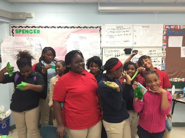 One of our Sisters 4 Science regulars, Alanah, mentioned to me that she wanted to repeat the slime experiment that Kiara had done with the girls last year. Making slime is a great way to learn about the chemistry of polymerization, so I made sure to introduce it to the girls. Alanah was not the only girl who was familiar with making slime, as Oshanti was able to tell us that the glue was the main component of the slime. That’s exactly right! Glue is composed of tiny molecules that are held in chains called polymers. When we add the liquid starch, the chains are able to link together and stick to each other to make the consistency of slime. The girls all got to work and were even able to add food coloring to their slime to give it a little flare.