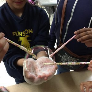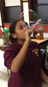 On the last day before a Christmas break, my girls had a mission to “keep bubbles alive.” Yes, keep bubbles alive. I works like this: once you blow on them, the bubbles disappear—that is what we’ve all experienced in our childhood. I had all supplies ready for them to make a recipe that makes a bubble alive—hand soups (that has glycerin in it or you could just use glycerin itself), laundry detergents, and sugar with water. The girls had to figure out how to portion these supplies and blend them. Then, I posed a question: “Do you think you need cold water or hot water? Or warm? You may want to consider this as you make a recipe.” They tried it with water at different temperatures and different proportions of each material. Teenaya, all the sudden, shouted “See, it bounces. It does. It stays on the floor.” Delhel said with an excitement, “Let’s time it and see how long it would stay there.” Again, Teenaya said, “We found what makes it alive. We need a lot, a lot of sugar.” “Yes, you do and make sure you dissolve all sugar in warm water,” I responded. “I see different colors in the bubble. See, there is purple,” said Melissa. The more sugar they added, the bigger a bubble was created. They even learned that they could create baby bubbles inside a bigger one. The more bubbles we blew, the more slippy the floor was, and we got to dance with the bubbles. Laughter. Messes. Bubbles. That’s how we ended this semester.