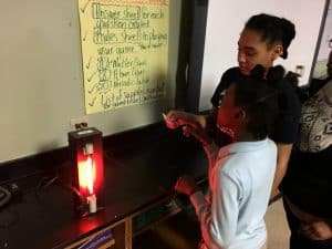 The next week Becca Thompson another student from the University of Chicago studying chemistry came in to show us a small portion of her research. Miss Becca brought a bunch of different samples of element lights, like a Neon light, and she taught us how each element has a different light pattern, kind of like a fingerprint. When we looked through the light diffractor we could see different color stripes for each element. At first, it was frustrating to get the angle right, but as soon as everyone figured out the right angle you could hear gasps of amazement echoing through the room.