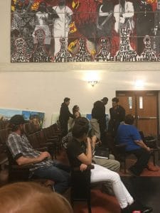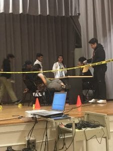 When the showcase started, they had the curtains closed and the scene set up. They started making screams and other sounds of someone being “murdered.” That’s when the curtains opened, and the “officers” and “detectives” were on scene. They introduced that they arrived at the crime scene and found two victims. At that point, the called the “Medical Examiner” Emilio Islas to come pick up the two victims. Once Emilio had picked up the victims, the “officers/detectives” had collected the evidence. They sent that evidence to the forensic laboratory where Melissa Herrera was going to run tests on each piece of evidence. Emilio had identified the two victims as Grace Batalla and Briana Quezada. They were both “murdered” by blunt force trauma. There were three suspects sitting in with the audience: Jacqueline Ortiz and two art program students were the three suspects. The “officers” went into the audience and arrested all three suspects. They brought the suspects up stage and started interrogating them. Melissa interrupts the interrogation with their findings. They said that the fingerprints found matched to the suspect Jacqueline Ortiz.