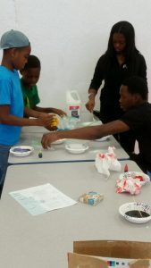The Science Giants’ second week at By the Hand was colorful! Literally! We went through at least 16 bottles of food coloring. The students showed the kids how to make slime and bouncy balls in order to teach them about chemical solutions and viscosity. The kids really enjoyed making the slime. Although they initially contorted their faces and stuck out their tongues as a sign of disgust, once they actually got into the activity their disgust was readily replaced by wonder and delight. The bouncy balls required a bit more patience as they had to roll their compound for quite a bit of time before attaining the desired, shape, texture, and springiness. As mentioned before, this week was very colorful. As a consequence of all their hard work and ball rolling, many had colorful hands afterward, which only added to the fun.