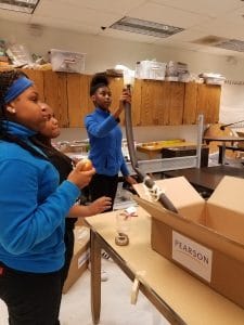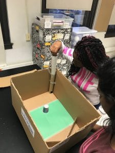 We started out discussing Mechanical Engineers and what they do. The girls at Spencer learned that Mechanical Engineers, in general, work with moving parts, which fit into our lives in the shape of machines and vehicles, like cars, and also in the buildings we use, like in elevators and our heating and cooling systems. Once we discussed Mechanical Engineers, we were ready to learn about pin-ball machines. Not all of the girls knew what they were, so we watched a video on how they work and then another about how to build one out of cardboard. Before watching the “How to” video, Aaliyah was asking why she needed to watch it. One of her Sisters4Science team mates told her it was so she could get some ideas of how to make one. Aaliyah didn’t say much, but was so engrossed in the video once it started playing, that not even jokes and laughter from the other girls could distract her. At the end of the video, she announced, “This is what I’m making – one exactly like this!”. It was heartwarming to see her to interested in the project. All of the girls had a good time thinking through the project, working in teams, decorating their boxes, and then showing them off and taking turns to play on the different models. They are having so much fun and learning so many new things!