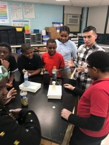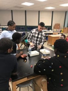 Jurassic World was brought to life at the Maker Mob event on December 14, 2017! As Project Exploration partnered with Northeastern Illinois University’s (NEIU) GEAR UP Program, the event took place at Kelly High School’s Family Night to expose and bring STEM opportunities to non-traditional neighborhoods and people. After families and partners enjoyed a few slices of warm pizza and cups of sizzling Pepsi in the cafeteria, Project Exploration utilized its facilitators to create and facilitate engaging STEM activities for families and children from all ages. One of the exciting and engaging activities that occurred was the Volcano and Dinosaurs activity. Using clay to cover a beaker, printing and cutting out cartoon dinosaurs, and household chemicals, the activity came to life when the volcano was active. This gave families and children a visual representation of the theoretical explanation of how dinosaurs became extinct due to volcanic activity billions of years ago. Families and children got the opportunity to learn how you can make an erupting volcano using mixtures of household chemicals and seeing a foamy reaction.