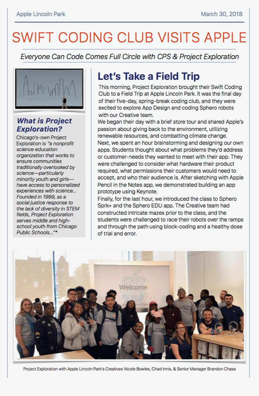 Project Exploration is thrilled to be a part of this partnership with Apple, CPS, and LRNG as we collectively work to empower our students to be 21st century learners and prepared for the growing technology workforce!