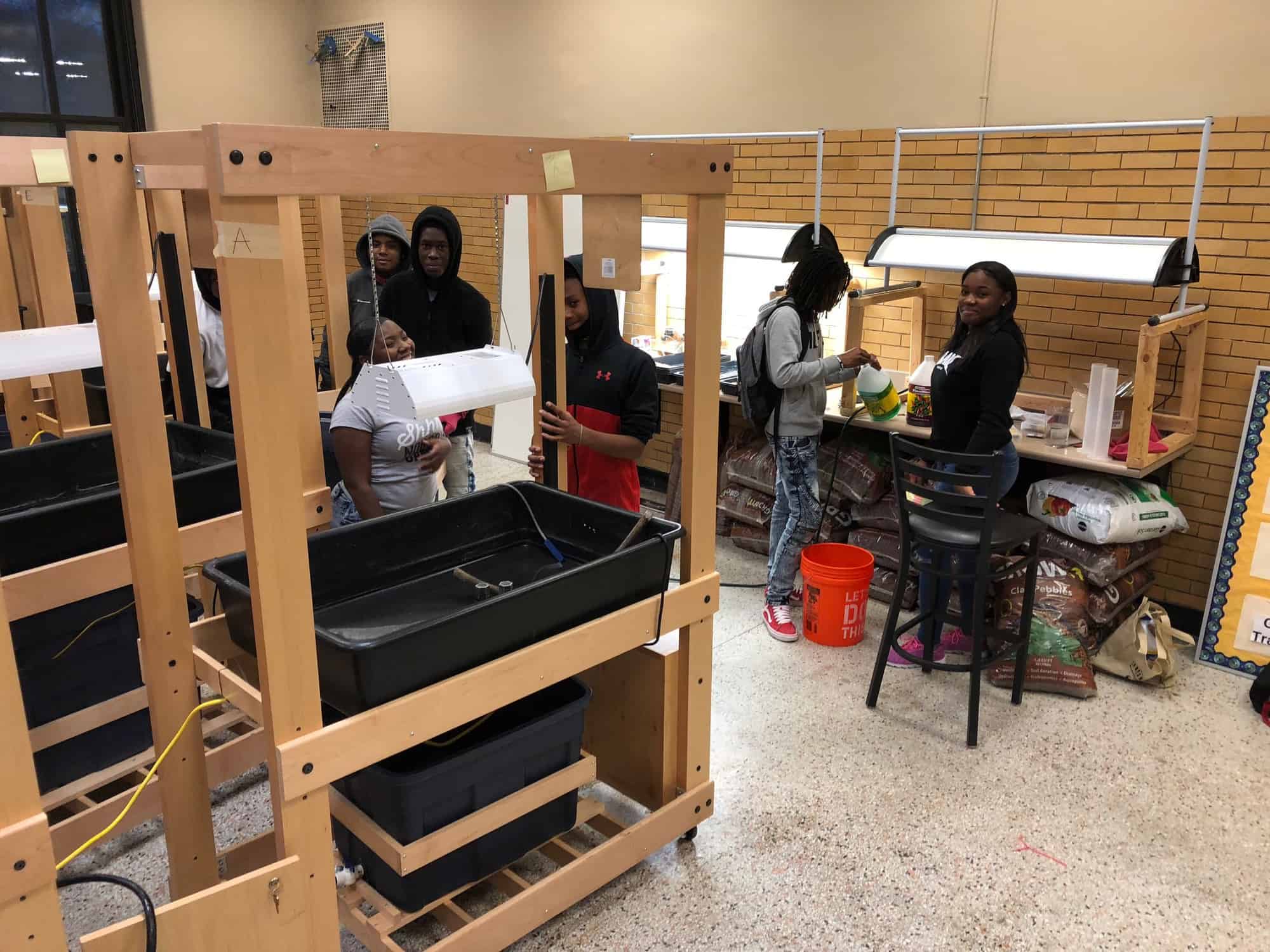 “Working with Project Exploration has been exciting, challenging and rewarding. I began facilitating Science Giants at Al Raby High school where our focus was on hydroponics, aquaponics and indoor growing methods. The students began the month by planting seedlings and outfitting grow-beds with new pumps purchased by Project Exploration. This allowed the students to learn how to replace pumps, troubleshoot existing pumps, and reset timers. They hung grow lights, gingerly planted delicate seedlings into grow-beds and mixed the right ratio of nutrients to the water. One day, at the end of the program I saw that a few students had written their names on a post-it and attached it to the first two grow beds. It was at this moment that I knew students were taking ownership of the grow lab and, like the lab we are making progress. I closed the door with a giant grin on my face. A smile only an educator knows after he/she is proud of the student’s work. Their work ultimately translated into seven fully functional automated grow beds with cucumbers, beans, lettuce, and basil. I along with the students are looking forward to December’s growth. It looks like it will be tremendous.” Anthony Ritter