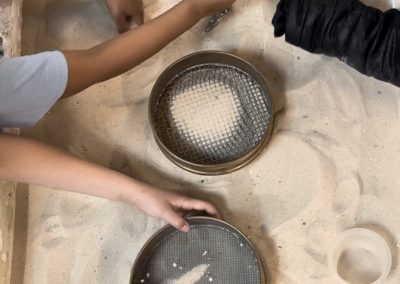 Students use sifters and spades to dig through sand to find pieces of material from ancient humans. Photo by Project Exploration.