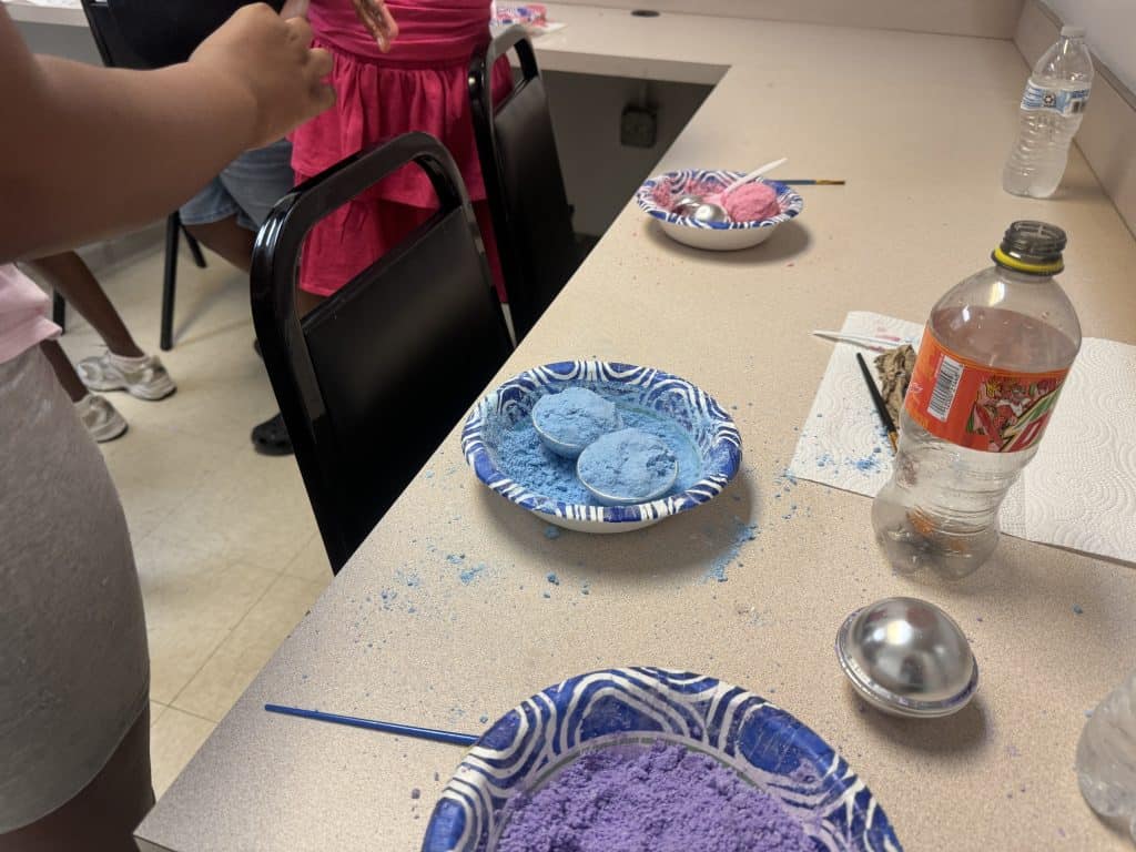 Returning indoors, the Sisters for Science embarked on their Beauty of Chemistry lesson: making DIY Bath Bombs. They learned how to make these magically fizzy and effervescent creations from everyday household ingredients: baking soda, corn starch, epsom salt and dyes. An important lesson in both chemistry and self care. Here we interrupted Zion as she gestured to a bath bomb with cupped hands, as if to reference its sculpted shape.