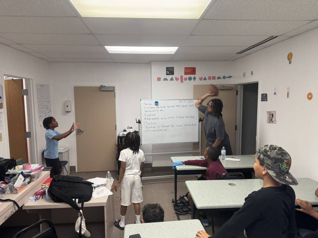 Meanwhile, in a different classroom, down the hallway, our Brothers for Science were learning about Sports Science. Throwing around a football—an elongated sphere—they learned about physics, sound, and parabolas.