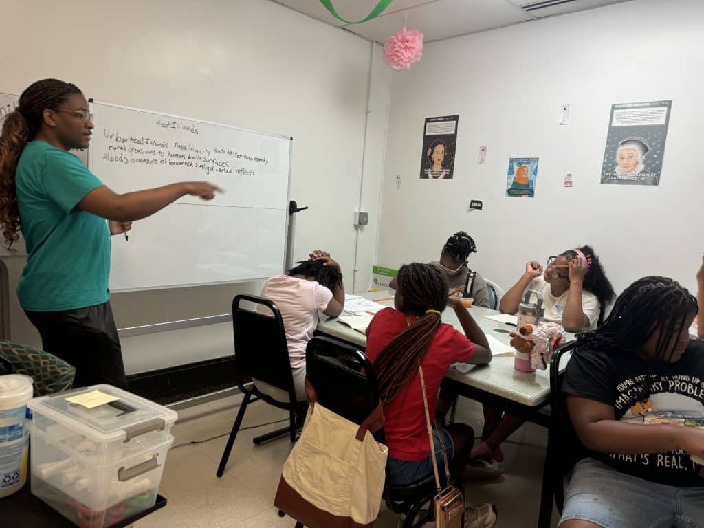 This hot Tuesday afternoon, we dropped in on our Sisters for Science as they were learning about urban agriculture and “Heat Islands.” As West Side Chicagoans, the sisters have experienced heat islands as significantly warmer neighborhoods surrounded by cooler neighborhoods — carved out by historical and infrastructural inequities. In fact, according to this map from a Chicago Tribune investigation, the average summer surface temperature (from 2013-2022) on the block containing the STEM Learning Center at Bethel New Life was 104.82°F. This is on the hotter side for Chicago, while cooler temperatures range from 88°F-103°F especially by the lake or in parks. Safe to say that this day, the sisters would gain the power of knowledge to combat this geological inequity affecting some of their neighborhoods.