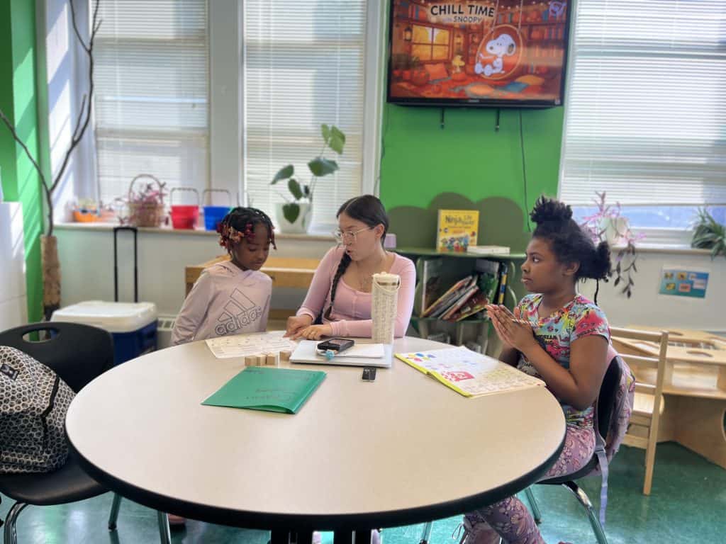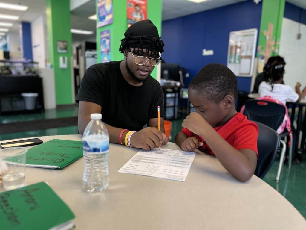 STEAMbassadors help students with their homework when they first arrive at program. Photo by Angelica Juarez for Project Exploration.