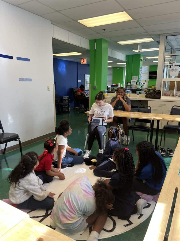 Students in Little Sisters4Science (3rd-5th grade) gather on a mat to discuss what they’ll be learning about this year. Photo by Angelica Juarez for Project Exploration.