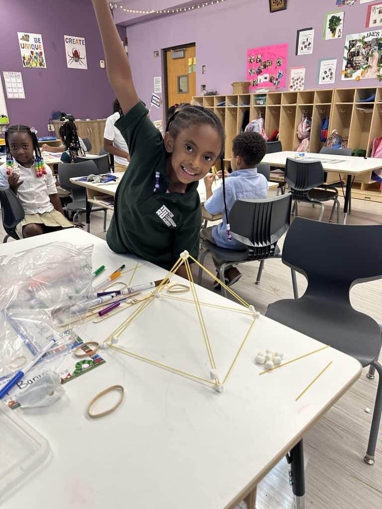 The students in the Building Block Program (K-2) also built a spaghetti tower where the challenge implementing a design process as a group. Photo by Gabriela Ruiz for Project Exploration.