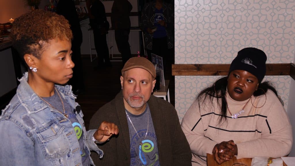 Left to right, Director of Brand Strategy Cachetta Potts, Bermudez and Director of the STEM Ecosystem Perriyana Clay talk about the relationships and collaborations at our Giving Tuesday fundraiser event. Photo by Benjamin Cummings for Project Exploration.