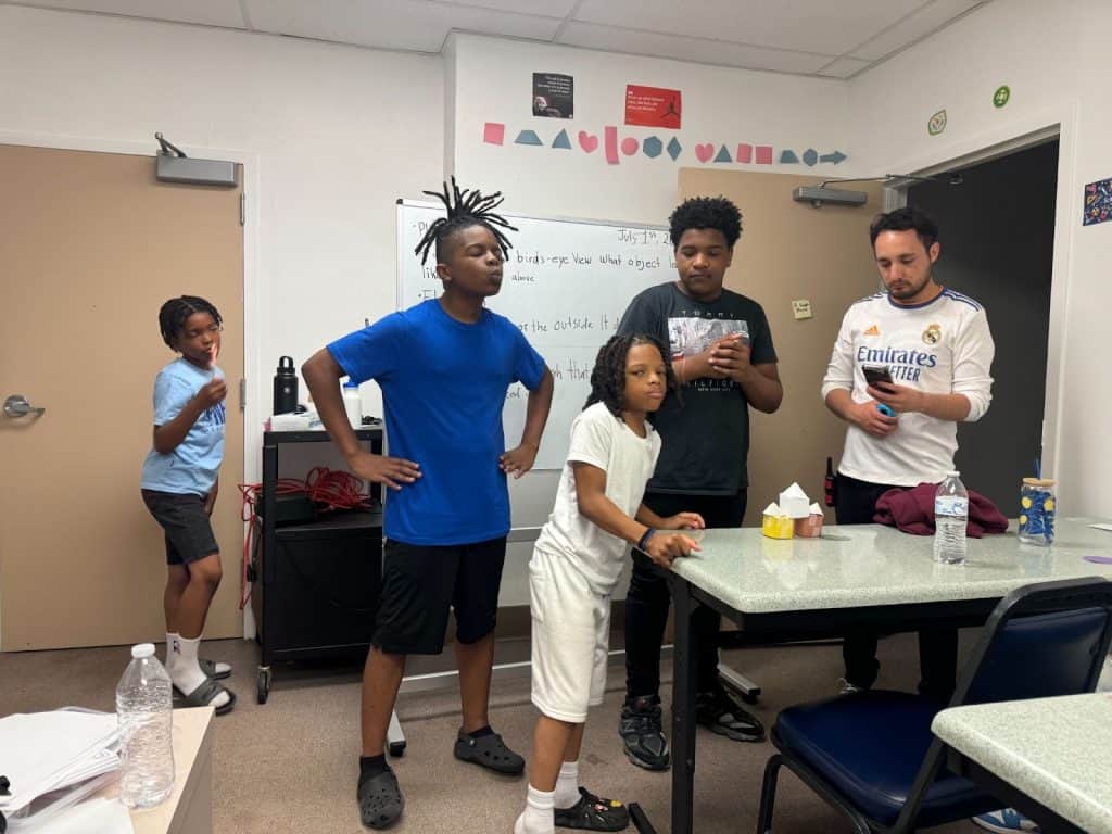 STEAMbassador Luis Avila times his students in the Brothers4Science, sixth to eighth grade boys, program in June 2025. Photo Photo by Benjamin Cummings for Project Exploration.