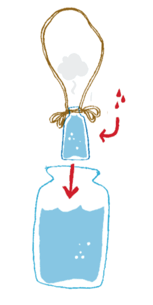 - Hold your salt shaker over the mouth of the jar by the string handle. Slowly lower the salt shaker into the jar until the shaker is completely submerged and resting upright on the bottom of the jar. Observe how the colored water erupts from the shaker into the cold water.